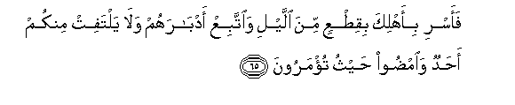 65. Faasri bi-ahlika biqitAAin mina allayli waittabiAA adbarahum wala yaltafit minkum ahadun waimdoo haythu tu/maroona