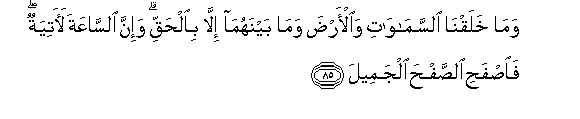 85. Wama khalaqna alssamawati waal-arda wama baynahuma illa bialhaqqi wa-inna alssaAAata laatiyatun faisfahi alssafha aljameela
