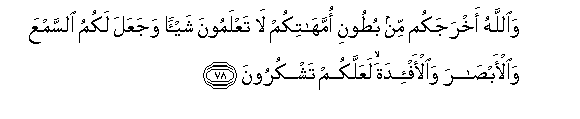 78. WaAllahu akhrajakum min butooni ommahatikum la taAAlamoona shay-an wajaAAala lakumu alssamAAa waal-absara waal-af-idata laAAallakum tashkuroona
