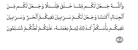 81. WaAllahu jaAAala lakum mimma khalaqa thilalan wajaAAala lakum mina aljibali aknanan wajaAAala lakum sarabeela taqeekumu alharra wasarabeela taqeekum ba/sakum kathalika yutimmu niAAmatahu AAalaykum laAAallakum tuslimoona