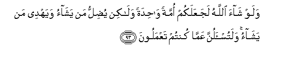 93. Walaw shaa Allahu lajaAAalakum ommatan wahidatan walakin yudillu man yashao wayahdee man yashao walatus-alunna AAamma kuntum taAAmaloona