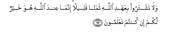 95. Wala tashtaroo biAAahdi Allahi thamanan qaleelan innama AAinda Allahi huwa khayrun lakum in kuntum taAAlamoona