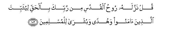 102. Qul nazzalahu roohu alqudusi min rabbika bialhaqqi liyuthabbita allatheena amanoo wahudan wabushra lilmuslimeena
