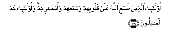 108. Ola-ika allatheena tabaAAa Allahu AAala quloobihim wasamAAihim waabsarihim waola-ika humu alghafiloona
