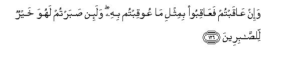 126. Wa-in AAaqabtum faAAaqiboo bimithli ma AAooqibtum bihi wala-in sabartum lahuwa khayrun lilssabireena