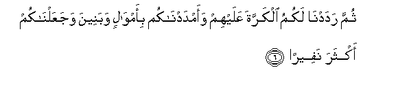 6. Thumma radadna lakumu alkarrata AAalayhim waamdadnakum bi-amwalin wabaneena wajaAAalnakum akthara nafeeran