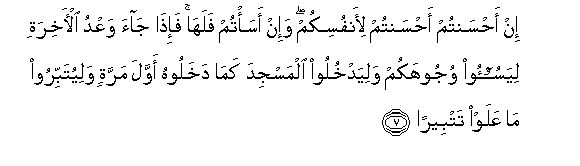 7. In ahsantum ahsantum li-anfusikum wa-in asa/tum falaha fa-itha jaa waAAdu al-akhirati liyasoo-oo wujoohakum waliyadkhuloo almasjida kama dakhaloohu awwala marratin waliyutabbiroo ma AAalaw tatbeeran