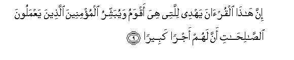 9. Inna hatha alqur-ana yahdee lillatee hiya aqwamu wayubashshiru almu/mineena allatheena yaAAmaloona alssalihati anna lahum ajran kabeeran
