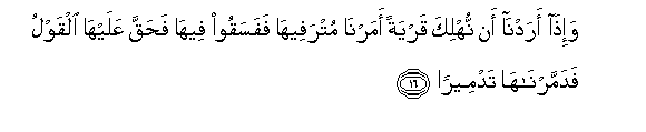 16. Wa-itha aradna an nuhlika qaryatan amarna mutrafeeha fafasaqoo feeha fahaqqa AAalayha alqawlu fadammarnaha tadmeeran