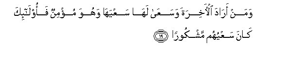 19. Waman arada al-akhirata wasaAAa laha saAAyaha wahuwa mu/minun faola-ika kana saAAyuhum mashkooran