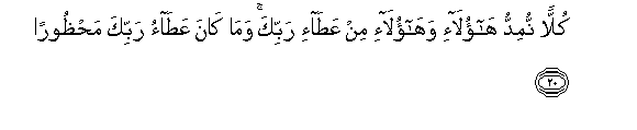 20. Kullan numiddu haola-i wahaola-i min AAata-i rabbika wama kana AAatao rabbika mahthooran