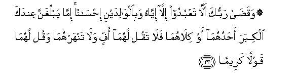 23. Waqada rabbuka alla taAAbudoo illa iyyahu wabialwalidayni ihsanan imma yablughanna AAindaka alkibara ahaduhuma aw kilahuma fala taqul lahuma offin wala tanharhuma waqul lahuma qawlan kareeman