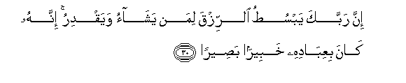 30. Inna rabbaka yabsutu alrrizqa liman yashao wayaqdiru innahu kana biAAibadihi khabeeran baseeran