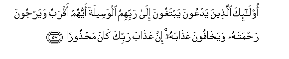 57. Ola-ika allatheena yadAAoona yabtaghoona ila rabbihimu alwaseelata ayyuhum aqrabu wayarjoona rahmatahu wayakhafoona AAathabahu inna AAathaba rabbika kana mahthooran