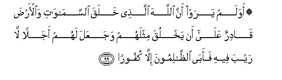 99. Awa lam yaraw anna Allaha allathee khalaqa alssamawati waal-arda qadirun AAala an yakhluqa mithlahum wajaAAala lahum ajalan la rayba feehi faaba alththalimoona illa kufooran