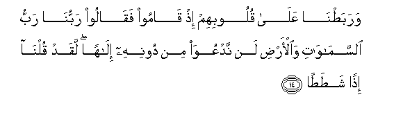 14. Warabatna AAala quloobihim ith qamoo faqaloo rabbuna rabbu alssamawati waal-ardi lan nadAAuwa min doonihi ilahan laqad qulna ithan shatatan