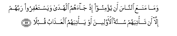 55. Wama manaAAa alnnasa an yu/minoo ith jaahumu alhuda wayastaghfiroo rabbahum illa an ta/tiyahum sunnatu al-awwaleena aw ya/tiyahumu alAAathabu qubulan