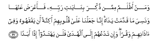 57. Waman athlamu mimman thukkira bi-ayati rabbihi faaAArada AAanha wanasiya ma qaddamat yadahu inna jaAAalna AAala quloobihim akinnatan an yafqahoohu wafee athanihim waqran wa-in tadAAuhum ila alhuda falan yahtadoo ithan abadan