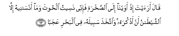 63. Qala araayta ith awayna ila alssakhrati fa-innee naseetu alhoota wama ansaneehu illa alshshaytanu an athkurahu waittakhatha sabeelahu fee albahri AAajaban