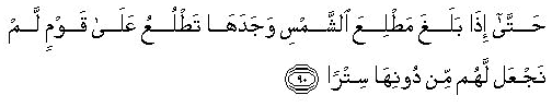 90. Hatta itha balagha matliAAa alshshamsi wajadaha tatluAAu AAala qawmin lam najAAal lahum min dooniha sitran