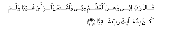 4. Qala rabbi innee wahana alAAathmu minnee waishtaAAala alrra/su shayban walam akun biduAAa-ika rabbi shaqiyyan