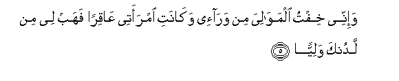 5. Wa-innee khiftu almawaliya min wara-ee wakanati imraatee AAaqiran fahab lee min ladunka waliyyan