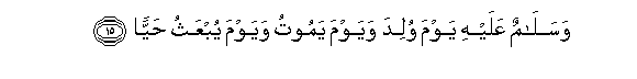 15. Wasalamun AAalayhi yawma wulida wayawma yamootu wayawma yubAAathu hayyan