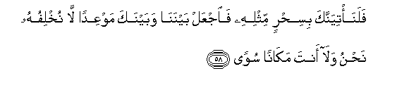 58. Falana/tiyannaka bisihrin mithlihi faijAAal baynana wabaynaka mawAAidan la nukhlifuhu nahnu wala anta makanan suwan