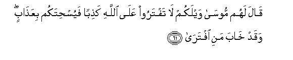 61. Qala lahum moosa waylakum la taftaroo AAala Allahi kathiban fayushitakum biAAathabin waqad khaba mani iftara