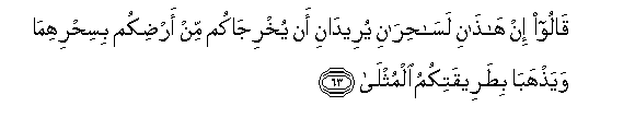 63. Qaloo in hathani lasahirani yureedani an yukhrijakum min ardikum bisihrihima wayathhaba bitareeqatikumu almuthla