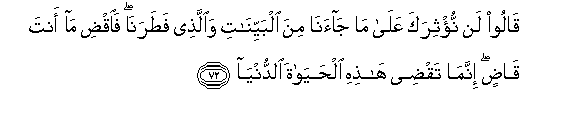 72. Qaloo lan nu/thiraka AAala ma jaana mina albayyinati waallathee fatarana faiqdi ma anta qadin innama taqdee hathihi alhayata alddunya