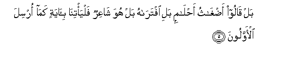 5. Bal qaloo adghathu ahlamin bali iftarahu bal huwa shaAAirun falya/tina bi-ayatin kama orsila al-awwaloona