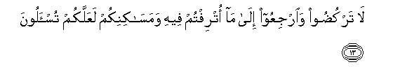 13. La tarkudoo wairjiAAoo ila ma otriftum feehi wamasakinikum laAAallakum tus-aloona