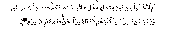 24. Ami ittakhathoo min doonihi alihatan qul hatoo burhanakum hatha thikru man maAAiya wathikru man qablee bal aktharuhum la yaAAlamoona alhaqqa fahum muAAridoona