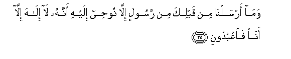 25. Wama arsalna min qablika min rasoolin illa noohee ilayhi annahu la ilaha illa ana faoAAbudooni