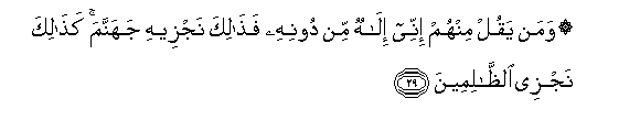 29. Waman yaqul minhum innee ilahun min doonihi fathalika najzeehi jahannama kathalika najzee alththalimeena