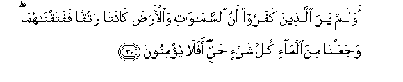 30. Awa lam yara allatheena kafaroo anna alssamawati waal-arda kanata ratqan fafataqnahuma wajaAAalna mina alma-i kulla shay-in hayyin afala yu/minoona