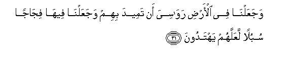 31. WajaAAalna fee al-ardi rawasiya an tameeda bihim wajaAAalna feeha fijajan subulan laAAallahum yahtadoona