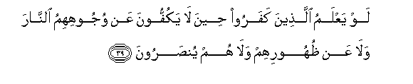 39. Law yaAAlamu allatheena kafaroo heena la yakuffoona AAan wujoohihimu alnnara wala AAan thuhoorihim wala hum yunsaroona