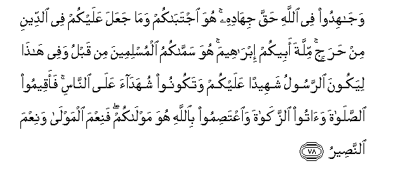 78. Wajahidoo fee Allahi haqqa jihadihi huwa ijtabakum wama jaAAala AAalaykum fee alddeeni min harajin millata abeekum ibraheema huwa sammakumu almuslimeena min qablu wafee hatha liyakoona alrrasoolu shaheedan AAalaykum watakoonoo shuhadaa AAala alnnasi faaqeemoo alssalata waatoo alzzakata waiAAtasimoo biAllahi huwa mawlakum faniAAma almawla waniAAma alnnaseeru