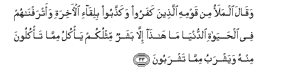 33. Waqala almalao min qawmihi allatheena kafaroo wakaththaboo biliqa-i al-akhirati waatrafnahum fee alhayati alddunya ma hatha illa basharun mithlukum ya/kulu mimma ta/kuloona minhu wayashrabu mimma tashraboona