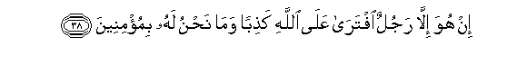 38. In huwa illa rajulun iftara AAala Allahi kathiban wama nahnu lahu bimu/mineena