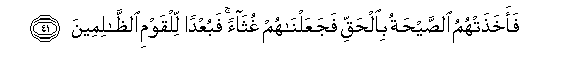 41. Faakhathat-humu alssayhatu bialhaqqi fajaAAalnahum ghuthaan fabuAAdan lilqawmi alththalimeena