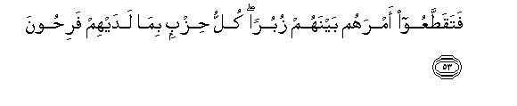 53. FataqattaAAoo amrahum baynahum zuburan kullu hizbin bima ladayhim farihoona
