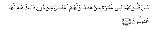63. Bal quloobuhum fee ghamratin min hatha walahum aAAmalun min dooni thalika hum laha AAamiloona