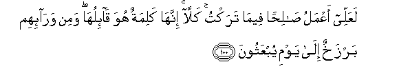 100. LaAAallee aAAmalu salihan feema taraktu kalla innaha kalimatun huwa qa-iluha wamin wara-ihim barzakhun ila yawmi yubAAathoona