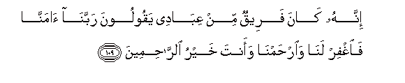 109. Innahu kana fareequn min AAibadee yaqooloona rabbana amanna faighfir lana wairhamna waanta khayru alrrahimeena