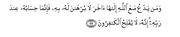 117. Waman yadAAu maAAa Allahi ilahan akhara la burhana lahu bihi fa-innama hisabuhu AAinda rabbihi innahu la yuflihu alkafiroona