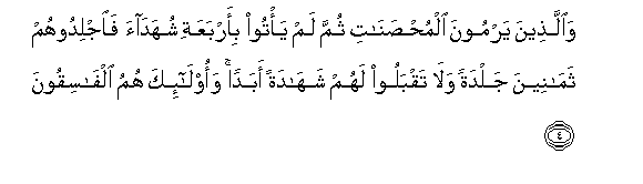 4. Waallatheena yarmoona almuhsanati thumma lam ya/too bi-arbaAAati shuhadaa faijlidoohum thamaneena jaldatan wala taqbaloo lahum shahadatan abadan waola-ika humu alfasiqoona