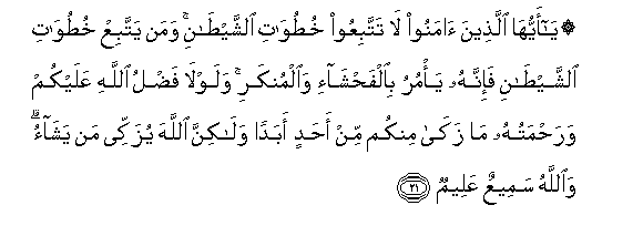 21. Ya ayyuha allatheena amanoo la tattabiAAoo khutuwati alshshaytani waman yattabiAA khutuwati alshshaytani fa-innahu ya/muru bialfahsha-i waalmunkari walawla fadlu Allahi AAalaykum warahmatuhu ma zaka minkum min ahadin abadan walakinna Allaha yuzakkee man yashao waAllahu sameeAAun AAaleemun